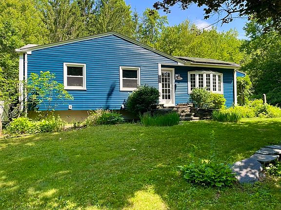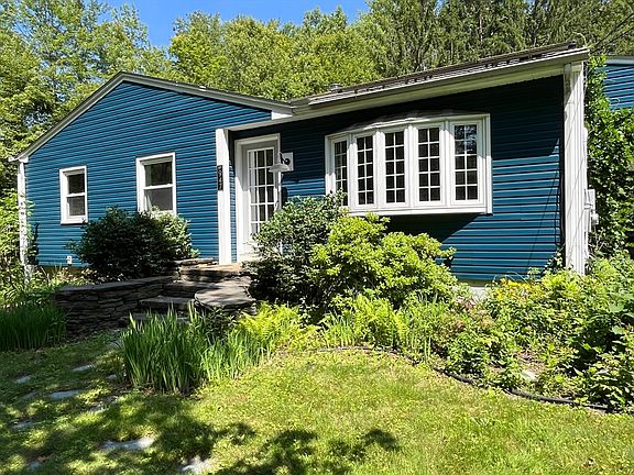 If you love indoor outdoor living this charming 2 bedroom ranch on 1/2 acre is the perfect match! Enter the side entrance through covered stone patio adorned with wisteria. The sprawling multi level Goshen stone patio is accessed through french doors from both kitchen and primary bedroom. The kitchen offers a dining area, newish appliances, stone counters, and movable island/ counter. The spacious primary BR features a cozy gas fireplace and abundant light. Oak floors cover both south facing bedrooms and Living Room. Four mini-splits ensure year-round comfort with back up natural gas heat. The basement includes a finished versatile space for media, studio, or gym, along with gas fireplace, laundry, storage rooms, & workshop. Stone walls frame the back yard with woods beyond, ideal for entertaining or a peaceful retreat. A carport with elegant lighting, solar panels, grill with gas hookup, complete the package. Convenient location to DT Florence, Northampton, and Easthampton.