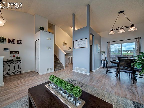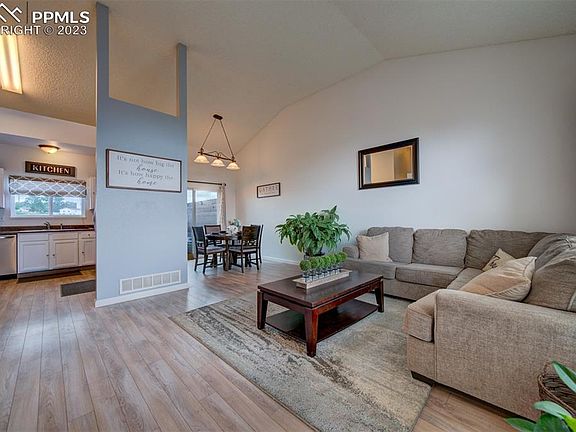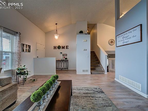Welcome to this spacious and ready-to-move-in home! It's conveniently located with quick and easy access to Ft. Carson. This property offers a range of desirable features making it an excellent choice for your next home. The large rooms throughout the house provide ample space for comfortable living. The interior has been freshly painted, giving it a clean and updated feel. The vaulted ceilings create an open and airy atmosphere, enhancing the overall sense of space. The kitchen is both functional and inviting, with an eat-in area and a separate dining area for more formal occasions. Two walk-outs lead to the deck and patio, perfect for outdoor entertaining or simply enjoying the fresh air. The large fenced backyard, complete with a manual sprinkler system, offers privacy and plenty of room to relax and play. Additionally, the rear of the property adjoins an open area, providing a tranquil backdrop. The master bedroom boasts an adjoining private 4-piece bathroom and two large closets, providing a comfortable and private retreat. Kitchen appliances and a washer/dryer are included, offering convenience and saving you the hassle of additional purchases. Don't miss out on the opportunity to make this move-in-ready home yours.