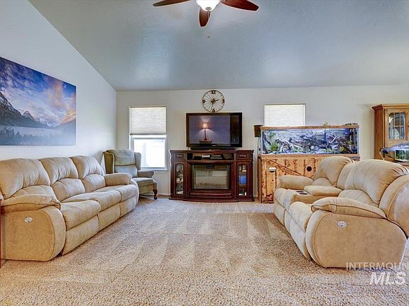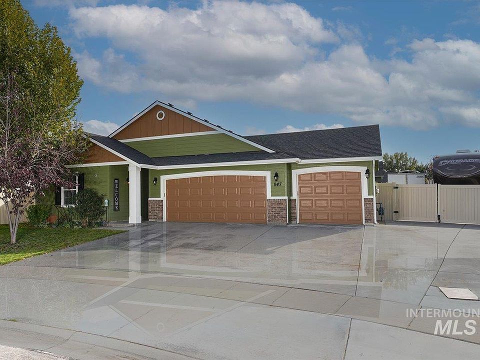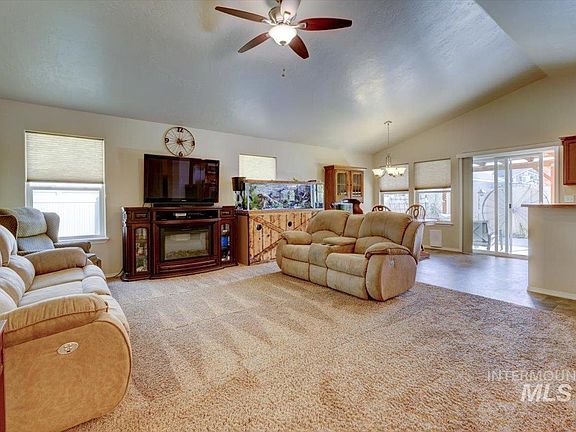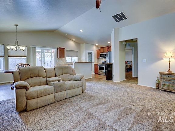 This single-story gem boasts 1,405 sq ft of living space, featuring 3 bedrooms and 2 full bathrooms. The open floor plan is crowned by a cathedral ceiling. Kitchen includes stainless steel appliances complete with a handy pantry and flows effortlessly into the living space. Your vehicles and recreational equipment will find ample room with the 3 car garage and the generous gated RV parking, fully paved and fenced. Space for 2 RVs and more included with the storage shed, your adventurous side is well-accommodated. Step out back to a covered patio stretching the entire width of the home. Let your stresses melt away in the included hot tub, all under the canopy of your eco-friendly, owned solar panels. Situated a stone's throw from neighborhood fishing ponds, the scenic Lake Lowell Recreation area, golf courses, St. Alphonsus Hospital and all of Nampa's modern conveniences. Discover eco-friendly living in this Nampa haven.