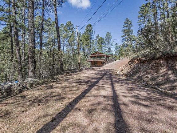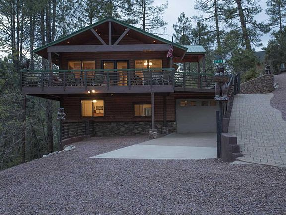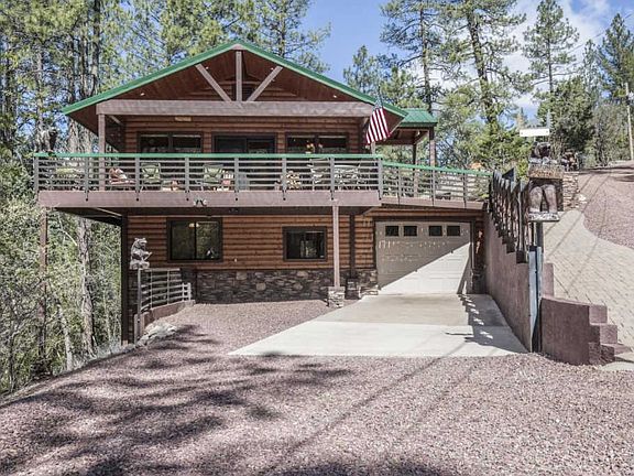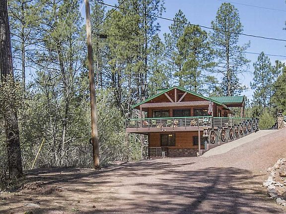 Escape your busy life and enjoy the mountain breeze and starry nights in this meticulously maintained home nestled in the pines of Kohl's Ranch. This updated home boasts an open living area and kitchen with granite counters, stainless appliances, farmhouse sink and breakfast bar/island overlooking the living room and cozy fireplace. The master is on the main level and downstairs includes 2 additional bedrooms, a bathroom, and game room with a wet bar. There is an unfinished 360 SF basement (not included in house SF). Relax outside on the front covered deck or out back in the spa. Enjoy lower maintenance with the metal roof and trex deck all the way around the house. This turn key home comes furnished minus the kitchen table & chairs. An additional 1.54 acres may be bought with the house.