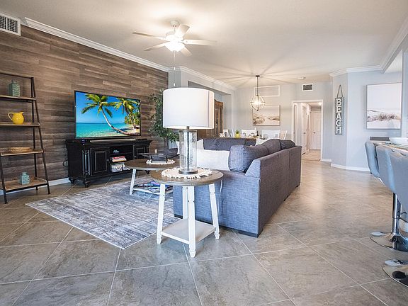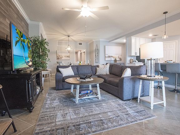 Beautifully furnished, 1st floor, Monthly turnkey unit with brand new furniture featuring a modern, well-stocked bright kitchen with a huge quartz island and numerous cupboards, a bay window dining area, and a computer desk with chair. The living room has a gorgeous trundle with nautical-themed rugs & decor. Perfect for lounging, and washer/dryer for convenience. Easy & close pool access. This HAPPY PLACE is a wonderful respite from the busy world.... tucked away in a gated community. Upscale, tranquil gated community with private marina, canoe launch, private gym, clubhouse, tennis courts and lodge. Kayaks available at Marina. 2 car garage, with ample spots available for visitors. Begin your enjoyment in paradise at this beautiful, welcoming community. With nightly sunsets and water views from the spacious lanai, this condo is more than suited for you and your family. With vibrant green landscapes, the property maintains it cleanliness and make sure it is kept up to par for everyone's tastes. This community offers playgrounds for kids to let loose, 3 community pools including a lap pool accessible to everyone in multiple locations, an onsite marina to ensure the safety of your boat, Port & court clubs that provide 3 Har-tru tennis courts with on site tennis professional, a pro & ship shop, and so much more. The River club offers dining for up to 120 people while basking in the views of the river. 2 Fitness centers, aerobics studio, sauna & treatment room available for those residing on the premises. The clubhouse offers a community kitchen, library, and rental opportunity for events. They host their own community events, welcomed for everyone. Feel safe and secured with 24/7 in person guarded gate. Close to major highways and shopping areas. With multiple nature trails and various canoe launching sites, you're one click away from connecting with peace and tranquility, and also nature. LONGTERM AVAILABLE Long term rental available. 6 months + 2 days up to 12 months with possibility to extend Monthly rate (please inquire within for rental rate confirmation) Plus one-time fees (such as: application fees, HOA fees, pet fees, etc.) Plus Security deposit