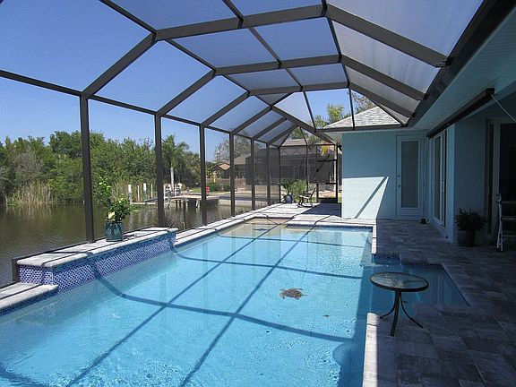 Stunning custom WATERFRONT home built by DM Dean located in a quiet neighborhood in desirable deed restricted South Gulf Cove. With 127 feet of water frontage. ** FABULOUS WATER VIEWS ** This light and bright home offers 3 Bedrooms, 2 Bathrooms and a huge extra deep 3 Car Garage. As you step inside, you are welcomed by the 14' tray ceilings, which you will find throughout the home. From the front door, you can see the abundant natural light come through the zero corner sliders ..and you can see the stunning view of the Large heated SALT WATER pool & look beyond over the beautiful canal...breathtaking!!