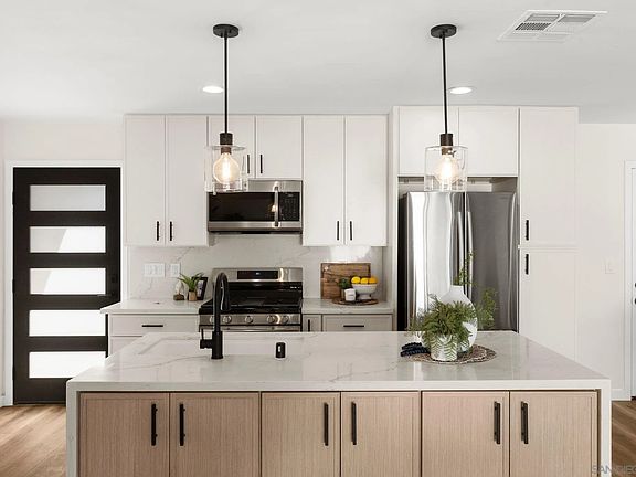 Newly remodeled (completed in November 2024) single-level contemporary is the ideal turn-key residence in Santee. Reimagined from top-to-bottom, this 3 bed, 2 bath home is located on a beautiful corner lot and offers clean lines, an ideal layout, and a light and welcoming ambiance. Walk through the open concept kitchen, dining, and living areas and out the new sliding glass doors to the large grassy backyard with patio and plenty of room for fun and relaxation. This home is the perfect turn-key contemporary with an elegant palette and designer style.