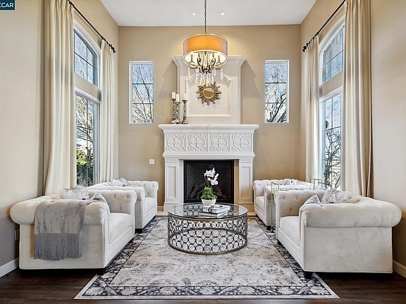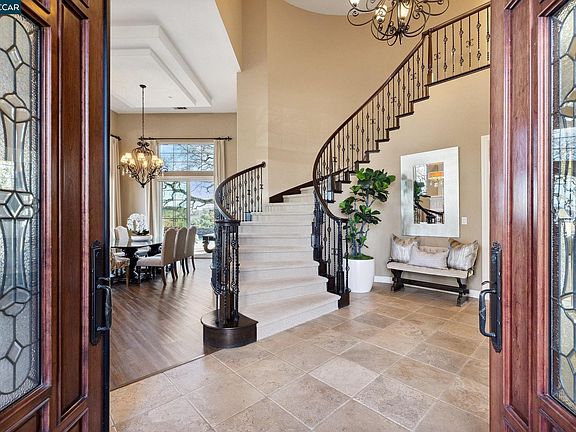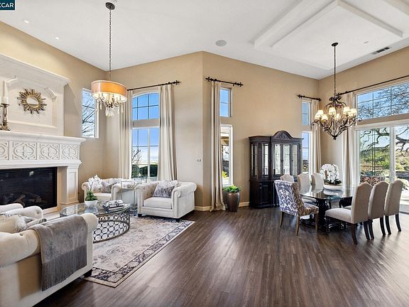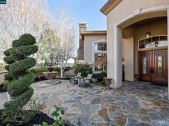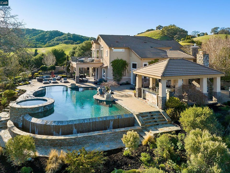 Indulge in luxury living at its finest at this one-of-a-kind Westside Hilltop estate, where panoramic valley and rolling hill views form a breathtaking backdrop. Be greeted by an opulent remodeled interior, complete with custom features and high-end finishes, and marvel at the gourmet kitchen, where white and quartzite surfaces shimmer and a Sub-Zero stainless steel appliance suite awaits. Sip cocktails in the great room with its custom cabinetry and full bar, or retire to the main level executive office with its own ensuite bath. Climb the grand circular staircase to reach the indulgent primary suite, complete with dual fireplace and an expansive custom balcony with a cozy firepit. From the multi-zone Sonos sound system to the owned solar panels, this magnificent estate leaves nothing to be desired. The detached 2-bedroom guest house is just as exquisite, with its own fireplace, Sub Zero refrigerator, and Wolf range. Step outside to the California room, featuring a fireplace and Wolf grill, soak in the infinity pool and spa, or play ball on the sport court. Direct access to the 5,000 acre Las Trampas regional preserve; proximity to Historic Downtown, Silicon Valley & San Francisco. 3rd garage bay is $150,000 golf simulator, seller will return to a garage at buyer’s request.
