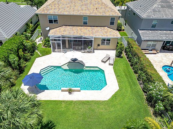 STUNNING! This LAKEFRONT, 5 bed 4 bath, POOL home is located in an A-RATED SCHOOL DISTRICT w/ LOWER HOA in highly desirable Oak Haven. The spacious floor plan downstairs boasts a sitting room, formal dining & large family room w/ patio sliders all surrounding a CHEF'S DREAM KITCHEN w/ granite counters, soft-close cabinetry, extended cooktop, large island, pantry w/ under-stair storage & breakfast area. A downstairs bedroom & REMODELED bath w/ MARBLE FLOOR, QUARTZ vanity & floor-to-ceiling designer tiled shower is perfect for guests. Upstairs, the luxurious master suite boasts an oversized walk-in & expansive en-suite bath w/ dual-sink extended vanity, walk-in shower & soaking tub. A 3rd bedroom enjoys its own en-suite bath w/ shower/tub combo & the 4th & 5th bedrooms share a Jack-n-Jill bath w/ extended vanity & frameless shower/tub combo. Entertain family & friends under the TRAVERTINE covered/screened patio, enjoy cool dips in the pool & let the kids/pets run around the fully fenced yard w/ gorgeous LAKEFRONT views. Oak Haven is a highly-desirable family friendly neighborhood w/ low HOA fee, A-RATED schools & boasts a 1 mile walking track complete with nature views & exercise stations. Located minutes from dining, shopping & world-renowned Wellington Equestrian Center!