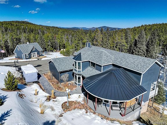 This charming Mountain Victorian on over 3 acres has a sought-after additional ADU with long-term rental potential. This property has an Aspen grove and seasonal stream and is ready for you to call it home. The main house has a newer roof with a warranty that conveys along with many updates/improvements (see supplements). A stamped concrete walkway leads you to the front door and into the large foyer. A dining room and living room grace the main floor along with a study/flex space. Living room has French doors and a electric fireplace. The updated kitchen with walk in pantry and all SS appliances features a copper country sink. The family room has a beautifully situated wood burning stove and exterior doors to a newer trex style deck for those mornings with coffee and watching the Hummingbirds and wildlife. The main floor entry from the garage has a large laundry room adjoining a mud/cloak room and main floor visitor 1/2 loo. Upstairs the primary bedroom with en-suite 5 piece bath w/walk in closet features a gas fireplace for cold nights. A library at the top of the stairs has a south facing office area with generous natural light. Two bedrooms and a full spare bath complete the upper floor. The finished lower level has a non-conforming bedroom (no closet). A new barn door leads to the family/exercise room with exterior doors to hot tub & dog run. Large storage area hosts the new tankless hot water heater. Two car garage and paved driveway. The fully appointed Carriage house/ADU is complete with new kitchen, all new appliances, 3/4 bath, upstairs bunk room and gas stove in the living room. Buyer to verify any/all rental possibilities. Plenty of parking spaces and a sturdy shed on the property. The road is county maintained and minutes to 285. Denver/DIA just minutes as well as the back side of Breck and onto Salida/BV. Plenty of open space, hiking trails just minutes away. Colorado living is ready for you. Call listing agent to schedule your private showing today!