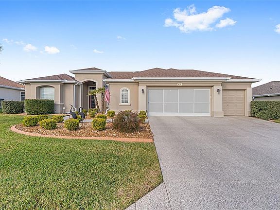 First time on the market, this beautifully maintained Hampton model offers 3 bedrooms, 2.5 baths, and an exceptional list of upgrades. The kitchen features quartz countertops, newer appliances, a gas cooktop, 42" oak cabinets, a skylight, and ceramic tile flooring.You are welcomed by double leaded-glass entry doors, set off by a designer-painted driveway and walkway with professionally maintained landscaping. Inside, the foyer opens to the dining room on the right, the living room straight ahead, and continues into the kitchen and family room. Ceramic tile flooring runs throughout the home, with engineered wood floors in all bedrooms. Plantation shutters are featured in nearly every room. The Florida room includes built-ins and a gas fireplace and is positioned for easy viewing from the kitchen, creating an ideal layout for everyday living or entertaining. The primary suite offers bay windows and a ceiling fan, while the ensuite bath includes a separate shower, soaking tub, double vanity with cultured marble countertops, and plantation shutters.The second bath has been completely remodeled with a walk-in shower and newer vanity. The utility room has been adapted for office use and includes abundant overhead cabinetry. The large, glass-enclosed lanai is equipped with a split HVAC system installed in 2022. Additional highlights include a spacious garage with a dedicated golf cart area with overhead door (or equivalent storage/workshop space), designer-painted garage floor, washer and dryer, and utility sink. Major updates include a new roof (2021), two HVAC systems (2021), Rinnai tankless hot water heater (2021), and a Generac whole-house generator (2021). The home has been meticulously cared for. Furniture is available separately.