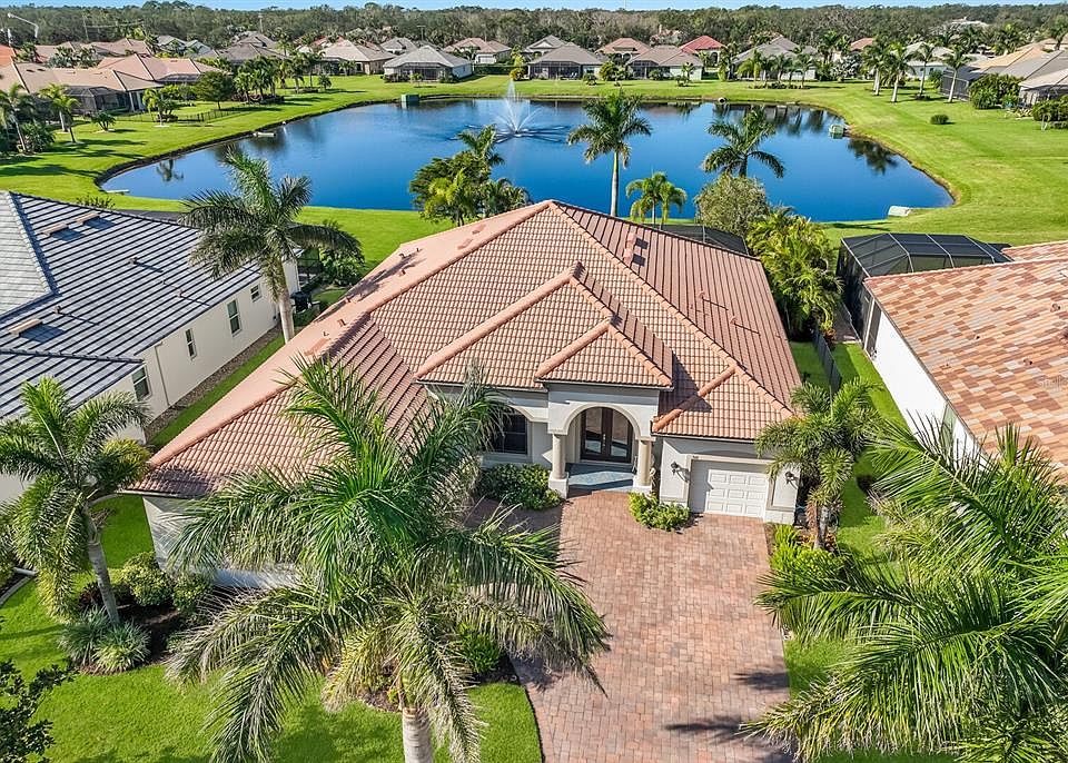 Custom Waterfront Pool Home in the Enclave at Country Meadows. Appreciate the architectural details and upgraded features that abound. This home is Florida living at its best with spacious indoor spaces and flowing outdoor spaces - all ideal for relaxing or entertaining with friends and family. Beautiful landscaping, royal palms, and lush tropicals greet friends and family. A welcoming double-door entry opens to a spacious floor plan that offers water views from most every room. This custom home is well-appointed throughout featuring plank flooring, crown molding, wood cabinetry, coffered and stepped ceilings, designer lighting, custom window treatments, and more. The chef in the family will appreciate the large kitchen with a breakfast area looking out over the water through the aquarium glass. The separate dining area has views and accommodates a larger dinner party. The owner's suite provides privacy, two walk-in closets, and a full en-suite bath. The two additional guest bedroom suites are split and offer friends and family comfortable space, and each guest suite has its own private bath. There is even a generous bonus room overlooking the pond that can serve as a game room, office, den, or fourth bedroom. The extended brick paver driveway leads to two separate garages. The deep two-car garage with extra storage is complimented with a second garage perfect for a third car, golf cart, and/or workshop. Outside you'll enjoy your own private heated saltwater pool and spa, screened lanai, grill area, fenced pet area, lighting, irrigation, tropical landscaping, and sunsets over the pond. Whether enjoying the pool and spa, dining under the stars, or entertaining on your lanai - you will find the water views and life around the pond a bonus. At every glance, you will notice extras and upgrades throughout this custom home. The Enclave itself is a gated community featuring sixty-eight custom-built estate homes - all on beautifully landscaped oversize lots - and close to golf, boating, beaches, shopping, restaurants, parks, preserves, and more. Wonderful neighbors, fabulous location, luxury features throughout this custom home, and no CDD fees. Discover your new home in the Enclave at Country Meadows - Florida living at its best.