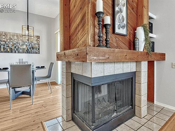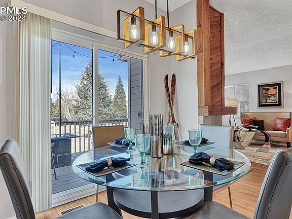 Can you imagine living in a cozy little neighborhood nestled between Valli High Golf Course (with its vintage-vibe Pub & Grill) and Roy Benavidez Park just steps away from your front door? It will be hard to decide where to enjoy your morning coffee or evening glass of vino in your new nest- Inside or Outside? The walkout patio is perched alongside a mini open space with gently rolling grass/river rock landscaping with lush trees strewn throughout. This corner unit has the advantage of extra windows providing you even more natural lighting and grassy/treed yard views. Inside, the ambiance is framed by a 2-sided wood burning fireplace, and windows that look out to the rolling landscape. The kitchen w/bar-height seating, has stainless-steel appliances-New stove & microwave & fridge (2023) dishwasher (2022). The wheat-colored LVP Flooring (2022) goes throughout the home and provides the perfect backdrop for the current color palettes that are so desirable. Enjoy vast views of the Rocky Mountain range and Pikes Peak as you stroll the walking paths along the golf course or take time in the park, just steps away from your front door. The laundry has a full-size washer & dryer, (new in 2022). The second bedroom, (staged as an office) has a full-size closet enabling various, wonderful uses for that room. The deck has just been repainted (2023) and the entire interior freshly painted (2022-23) Fun extras include a Smart Thermostat, Ring Doorbell, vaulted ceilings and updated light fixtures. There’s a clubhouse for hosting any large get-togethers you may want to have and additional parking for guests throughout the circular driveway. It is perfectly positioned to be able to get to the Colorado Springs Airport within 13 mins., Ft Carson in 15 mins., Peterson AFB in 10 mins., and I/25 to head north in 6 mins. An extensive list of the recent expensive updates and their costs will be available to you when you “Come take a look inside!”