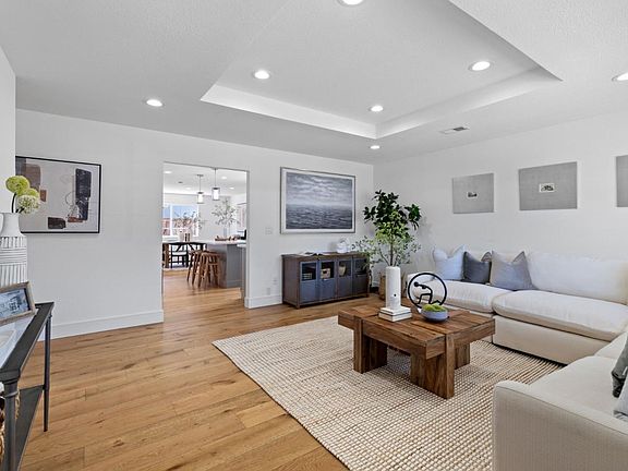 Stunning modern retreat tucked away in a peaceful cul-de-sac. This light & bright remodeled home seamlessly blends contemporary design with functional living spaces, offering the perfect blend of style & comfort. The wide plank white oak hardwood flooring throughout is grounding, while offering durability for everyday living. Chefs kitchen featuring an eat-in island, illuminated by a skylight overhead & stylish pendant lights, with stainless steel appliances, including gas cooktop & oven. Entertain with ease in the spacious dining area that leads out to the backyard. With four bedrooms, there's ample room for everyone to spread out. The master suite is a true oasis, complete with a ensuite bathroom. The 2-car attached garage has been thoughtfully transformed into additional living space, providing endless possibilities. + a large shed offers even more storage space. Step outside into the low maintenance backyard, where a pergola with a fan creates the perfect spot for year-round enjoyment. And with a NEST thermostat controlling the central AC, you'll stay comfortable all year long. Other notable features include a new roof, ensuring peace of mind for years to come. Close proximity to freeway access, schools, shops & dining.