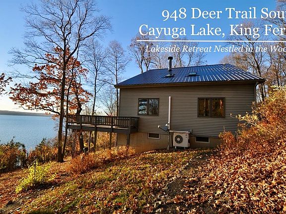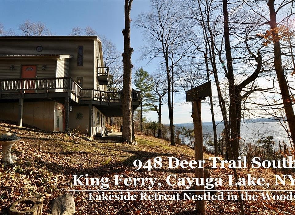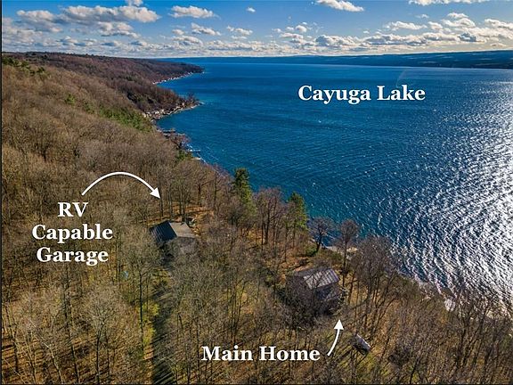 1st time on market. This custom built, 3 level yr. round, Contemporary lake home sits on over 7 acres and is the last house on the road. This wooded oasis has spectacular 180 degree lake views on the East side of Cayuga Lake, just south of Aurora with deep clear water. Sunsets are your evening's entertainment. Meticulously maintained with attention to detail creates the most amazing back drop for life's day to day adventures. Open concept, double sided center room fireplace, kitchen, living and dining areas with access to the large decks. Lower level bedrooms, laundry, storage and family room with access to the lower deck. The private primary bedroom suite has a lake side balcony. There are 2 parcels. The 40 feet of lake front has EZ access, door to door, to the Cabana house, dock and hoist with an oversized, 3+ car garage with RV overhang w/ hookups. The purposeful outbuildings, trails and fire pit area create a park like feel, all with lake views. Easy commute to Ithaca, Geneva, Auburn, Rochester, Syracuse, Cortland. In the heart of the Finger lakes and the East side of the Cayuga scenic byway & wine trail. Don't forget it's a navigable water way. Sq. Ft. measured by owner.