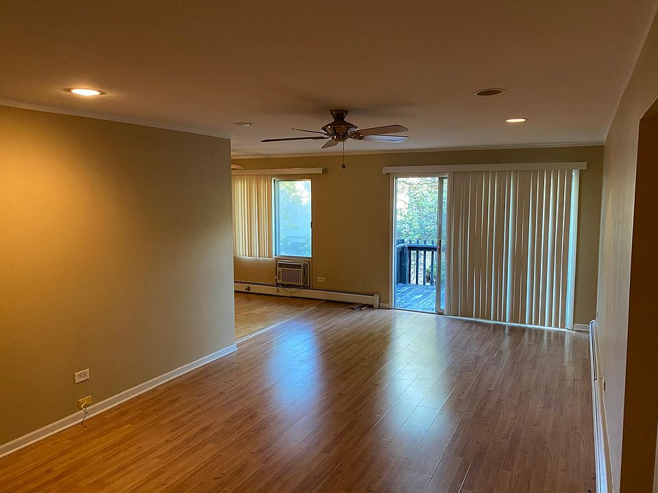 Cozy one bedroom apt, second floor. Stainless steel appliances, hardwood floors, A/C, updated kitchen, huge balcony, free parking, summer pool. Tenant pays only ComEd bill.