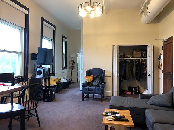 Sunny, quiet 3rd fl 1 bed/1 bath condo in a centrally located, convenient location in a converted Waltham school building. Take the elevator to the unit, which features an open concept kitchen/dining/living area, large bedroom and bathroom, with washer/dryer stack in the unit. 12-foot ceilings give the feeling of super-spaciousness and lots of closet space gives you room for your stuff. Large south-facing double-glazed windows let in light, keep in heat during the Winter, and keep in cool from the central A/C in the Summer. Added to that, there's a full-size basketball court on the first floor! 2 deeded off-street parking spaces are included in the rent. 5 minutes to I-95 and the Mass Pike, nearby bus routes to Boston include 553, 554, 556 and 505, with the Fitchburg Line commuter rail stop 10 minutes away at Waltham Common, taking you in to North Station. Hannaford and Market Basket are equally close, across the street is a Wallgreens. Furnished or unfurnished.
