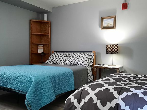 Ground floor entrance. The bedroom has a full bed and a twin bed with darkening thermal curtains.