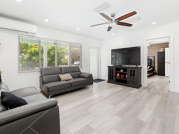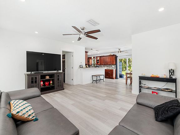 This stunning, fully renovated 3-bedroom, 2-bathroom home is located on a cul-de-sac. The home features an open floor plan, allowing an abundance of natural light. The gourmet kitchen showcases custom cherry cabinetry, granite countertops, a stylish tile backsplash, and all stainless steel appliances, including a double sink. The new custom vinyl flooring throughout the home adds a sleek and contemporary touch, while the separate laundry room adds convenience. Full impact doors and windows not only enhance the home's safety but also contribute to energy efficiency, helping reduce insurance and cooling costs. Home has central a/c and mini splits to further save energy! Outdoor living is made even more enjoyable with a spacious back patio featuring new travertine flooring, perfectly matching the travertine on the front porch, adding to the home's impressive curb appeal. Perfect for a primary residence or income-producing property. Located just a few minutes from the beach, restaurants and shops. This gem of a property will not last long on the market!