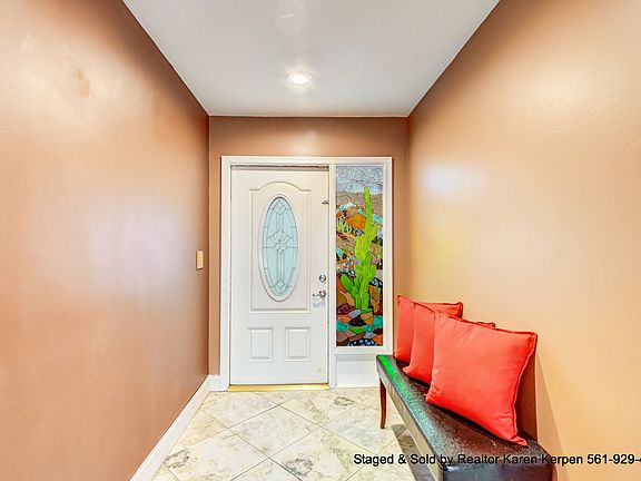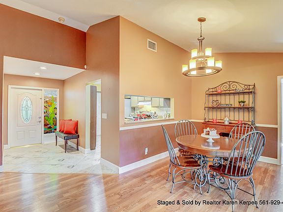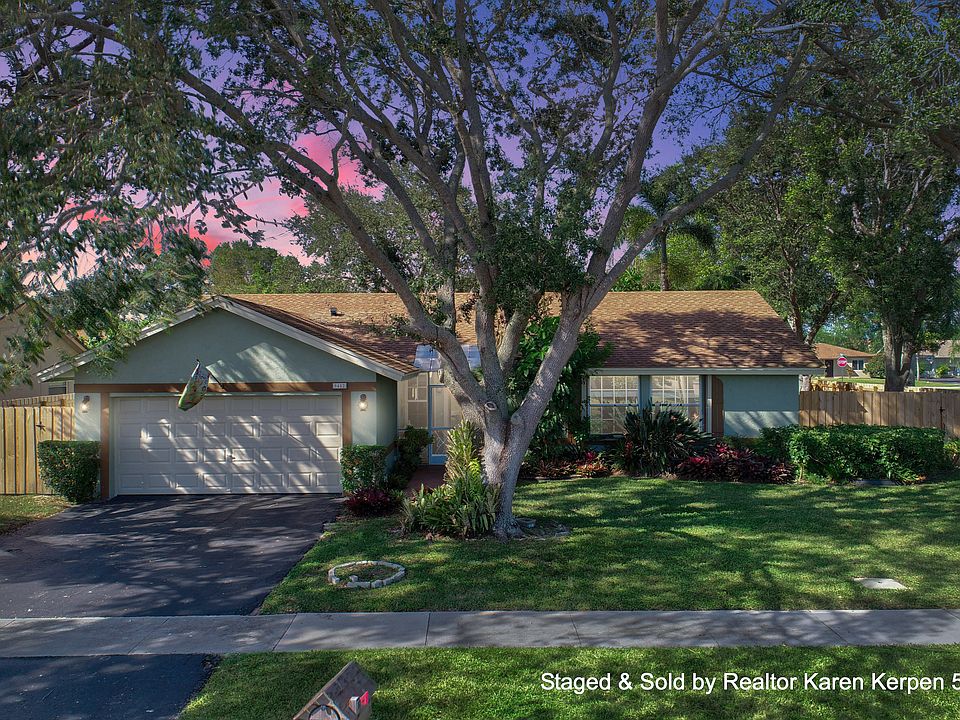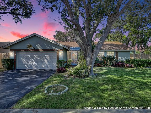 Well maintained corner lot home that has it all! You can't help but notice the beautiful mature trees & landscaping as you pull up. This home has amazing curb appeal. 4 bedroom, 2 Bath, 2 car garage, screened front porch/huge screened in back patio, on a huge corner 8,188 square foot lot. Enter through your stained-glass front door. This fabulous home is open & bright w/cathedral/vaulted ceilings, french doors, & a split floor plan. Living area has tile/laminate flooring and bedrooms have carpet. Sunny eat in kitchen with all new stainless appliances including Bosch dishwasher and granite counter tops. Master has a walk-in closet, dressing area, & sliders that lead to the back patio/yard. Knockdown ceilings throughout. No popcorn ceilings (except in garage). Large screened/covered patio(almost the length of the entire house) overlooks your huge & private fenced in(brand new fence Jan 2018) yard. It is perfect for entertaining or just relaxing with a book! Jacuzzi is included. The screening in the front and back was replaced 2 years ago with a high grade scratch resistant screening. Mature landscaping including mango, plumeria trees, royal palms, oaks w/ orchids, and night blooming jasmine! Tons of plants that butterfly's love including fire bush, firecracker bush and more. Living square feet is 1497(under air)and the total square feet including the garage and covered patio is 2409 Total square feet. Roof from 2006 (roof was just sealed). Accordion shutters (2017). New hurricane rated garage door from Broten (2017). New electrical panel inside & outside (3 years ago). A/C is from 2012. Hot water heater is 3 years old. Maytag washer & dryer is 3 years old. Southwind Lakes/American Homes community has a low HOA fee of only $57 a month and features 2 parks, community pool, tennis, basketball, & more. Sold and staged by Realtor Karen Kerpen w/Realty Home Advisors 561-929-4737. Thinking of selling your home? Call me today for a Free Home Value Analysis.