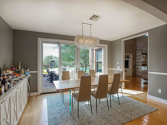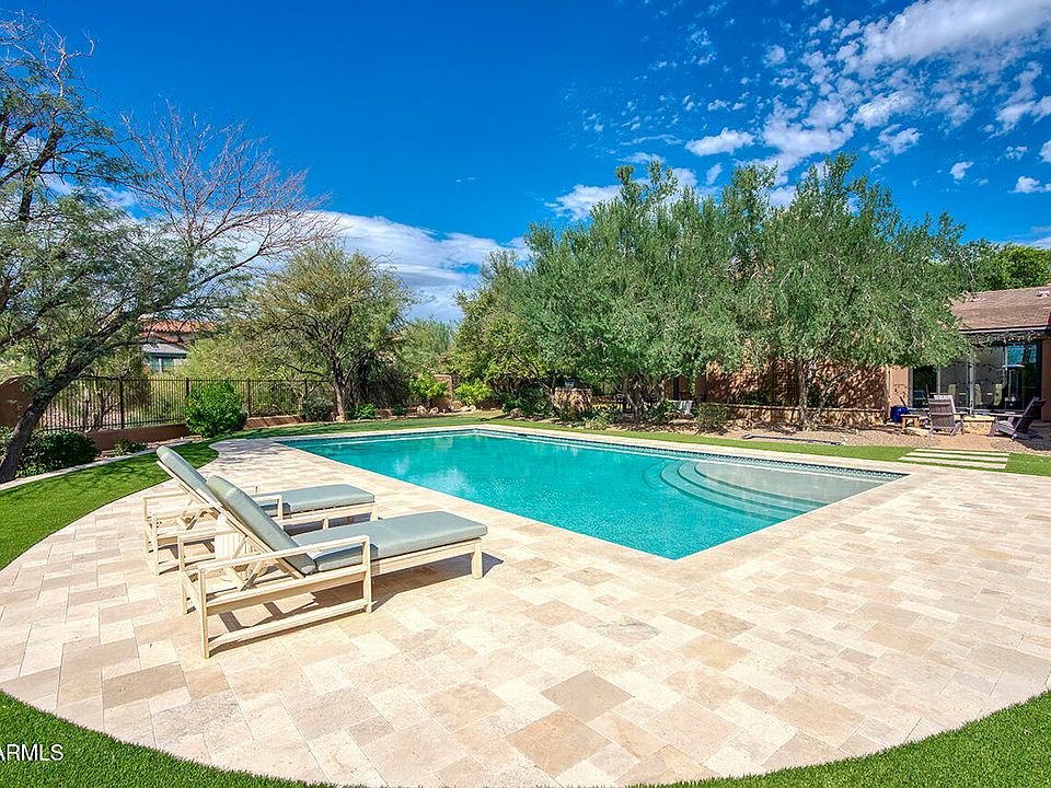 DC Ranch Estate located in highly esteemed gated community. Situated on one of the largest cul-de-sac lots in the community, this beautifully maintained home offers a bright, open interior with 4 spacious bedrooms and 3.5 bathrooms with brand new Large Resort Pool. Chef's Kitchen boasts amazing Hardwood Cabinetry--Floor to Ceiling with amazing storage capacity, Stone Faced Range Hood--Stainless Steel appliances, and generous Granite Counters with beautiful Chiseled edges. Enjoy casual dining in the generous eat-in kitchen or at the breakfast bar, while the formal dining room—complete with custom doors—opens directly to the lushly landscaped backyard. Designed with entertaining in mind, the backyard showcases multiple outdoor living spaces, including two large patios, a built-in BBQ, and , and a gas fire pitperfect for gatherings year-round.