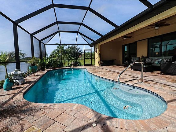Your Tropical Oasis awaits! This 2017 Waterfront Gulf-Access Pool Home with 105' water frontage and HEATED POOL offers spectacular sunrises & fabulous views! Your Coastal-Inspired 3 Bed 2 Bath Open Concept home features Volume Ceilings, Crown Molding, Low-E Impact Windows, Doors and Sliders, Granite Counters and Upgraded Tile throughout. The custom Kitchen is ABSOLUTELY LOADED with UPGRADES, such as 42" wood cabinets, under cabinet lighting, soft-close drawers and doors, Stainless Appliances including INDUCTION COOKTOP, vented stainless hood, below-counter MICROWAVE, Built-In OVEN, and brand new REFRIGERATOR, designer Island with extra prep and seating areas, and a separate built-in Desk area with lit cabinets and glass doors. The home office is spacious enough for a desk and credenza, or can be used as flex space for sewing, collections, or a music studio! Expand your entertaining space with ZERO CORNER pocket sliders, In-Ground Pool, screened-in lanai, pre-plumbed Outdoor Kitchen, and sundeck area for a Tiki table (available separately). The spacious Guest Bedrooms with Pool Bath are offset with a pocket door, and the Master Suite boasts Tray Ceiling, Transom Windows, His and Her Walk-ins, Linen closet, Tiled Roman-Shower, Ceiling Fan, and Sliders to Lanai. Laundry Room with large closet, 3-Car Garage, Pull down Stairs, Landscape Lighting, Power and Water for Boat Dock, Professional Landscaping, Irrigation with pump to canal, paver walkways and more! Check out the DOLLHOUSE TOUR and call for showing!