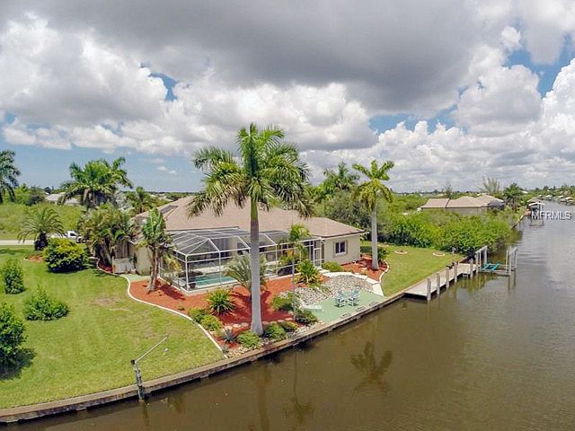 Single Family Home, Custom - PORT CHARLOTTE, FL Gorgeous custom built home on 2 canal front lots. This 3 bed/2 bath home built by Fero Construction boasts ceramic tile throughout the main living areas, tray ceilings, and crown molding. Large great room has gas fireplace and sliding glass doors leading out into the expansive lanai with pool and spa overlooking the serene water views. The kitchen features solid wood cabinetry, Corian countertops, built-in oven, and breakfast nook with aquarium windows offering views of the pool/spa and canal. Formal living room features vaulted ceilings with a large stone gas fireplace. The master suite has a walk-in closet, sliding glass doors to the lanai, master bath with dual sinks, garden tub, and a walk-in shower. The exterior features mature landscaping, large concrete dock and boat lift, and concrete patio. Separate vacant lot located across the street is included in the sale. Zoning for lot is RSF 3.5.