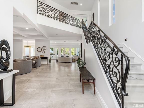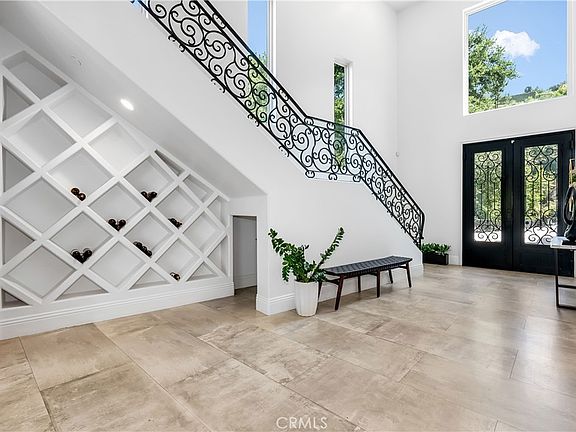 This contemporary Mediterranean-style home blends modern luxury with timeless elegance. On the first floor, you'll find three bedrooms, one of which is a second primary suite. The gourmet kitchen is a chef's dream, featuring two islands, a large fridge/freezer, and a professional range. A wall of oversized French doors opens to the gated yard, revealing breathtaking canyon views. The property is adorned with wood floors, raised ceilings, imported European tiles, and large windows that flood the space with natural light.