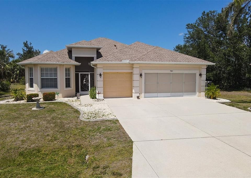 HOME SWEET HOME! Beautifully maintained and sure to please, call this home yours! This 3 bedroom, 2 bath, den, pool home in sought after South Gulf Cove is right in the middle of everything, just minutes to multiple beaches, golf courses, and family-owned restaurants. This home welcomes you the minute you walk in, immediately you notice the 10 ft ceilings, tile flooring throughout except for the bedrooms, and views of the pool through 8 ft sliders! The dining room is spacious and offers plenty of room to comfortably seat family and friends. The home office is conveniently tucked close to the primary bedroom with views out the front of the home. The kitchen is just around the corner and offers granite countertops, breakfast bar, large pantry, and a “cityscape” cabinetry layout. The kitchenette is conveniently located with an 8 ft slider to the pool/lanai and a large picture window, making it a great place to plan your day over morning coffee. Warmth and comfort is the perfect description for the family room, relax while still seeing the action going on in the pool. Watch tv by the built-in entertainment wall with windows that grace each side. The primary suite in this split plan is light and bright with a volume double tray ceiling and 8 ft sliders opening to the lanai and pool, making the room even more spacious and able to accommodate even the largest furniture. The ensuite includes a large walk-in closet, dual vanities, garden tub, and tiled walk-in shower. The two guest bedrooms and full guest bathroom are entirely private and located adjacent from the primary suite. The outdoor space area is NOT to be overlooked. Perfect for entertaining, the lanai is large enough for multiple enjoyment. There is an under-roof line area to enjoy out of the Florida sun, deck space for lounging or simply floating in the pool. Other features include but not limited to, NEW ROOF 2022, A/C 2021, security system, 3 car garage, and storm shutters. HOME WARRANTY INCLUDED FOR BUYER! Make your appointment and see this beauty today!