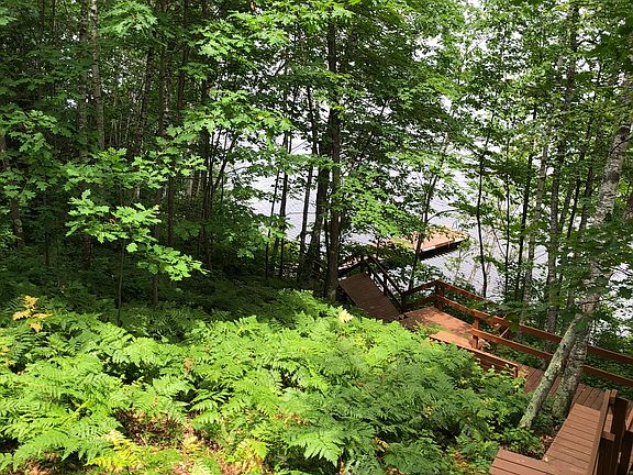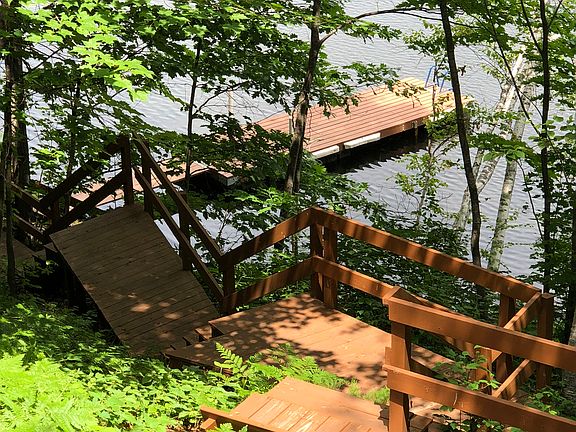 Everything about this truly adorable Chalet style home will pique your interest. With 2 main level bedrooms and a well-appointed main level bath and a spacious loft bedroom with private half bath, you have plenty of sleeping room! Warm and delightful decor, with attention to detail throughout this home. The living room has tongue & groove throughout, a stone fireplace that adds a warm focal point to the room, and large lakeside window! The knotty pine continues in the open concept kitchen and dining area which has sliding doors to the lakeside deck, making dining or barbecuing with views easier than ever! The finished walkout lower level has laminate flooring, plenty of storage, an additional family room and dining area, and a 3rd bath! New metal roof on both garage & home! New blacktop driveway! 3 car det. oversized garage, cute garden shed, and all of this leads you to the 150' of sand frontage on picturesque Little Bearskin lake! Furnishings included!