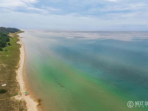 Great Lake Michigan cottage with 171 feet of private sandy beach. This low bluff cottage provides the perfect vacation spot for your whole family. Lake Michigan lakefront living at its best with expansive deck with panoramic views of Lake Michigan sunsets. A short path leads to your own private beach. Nicely updated home in 1995 features 5 bedrooms that can sleep up to 16 people. Open floor plan with lots of windows, large kitchen, large dining area, and master suite on the first floor. The main level also includes a second bedroom and 2 full baths. Upstairs there are 3 more bedrooms and 2 baths. The unfinished basement features another bath. lots of storage, and a single stall garage. This home features over 2000 sq ft of finished living space on 4.27 acres