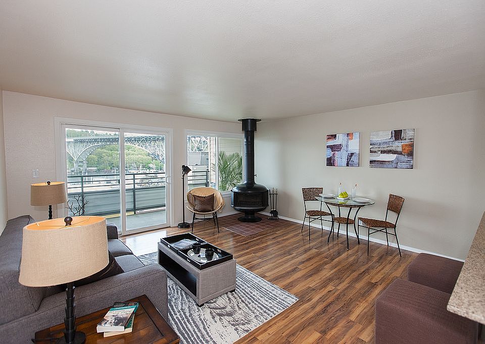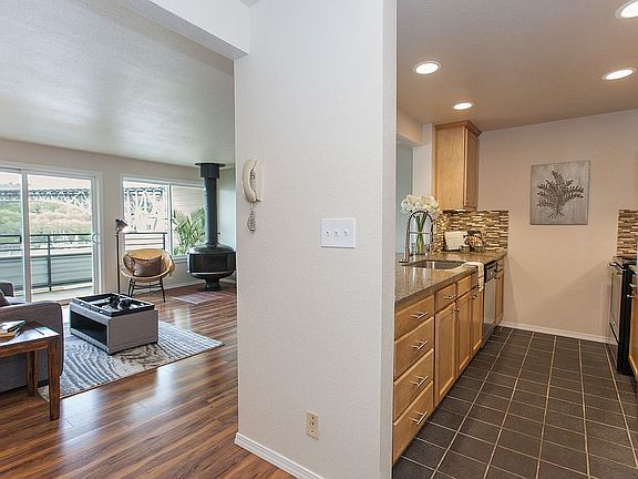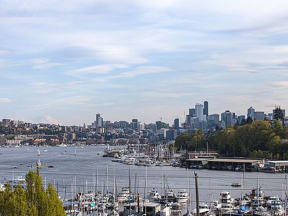 Top floor unit offers views of lake union, downtown & Mt Rainier. 2 blocks to Fremont, Burke Gilman trail, shops, pubs and more! Complete remodel, new stainless steel appliances, quartz counter tops, fresh paint, flooring. Views from both the bedroom and living room. No assessments, No rental cap. 1 parking spot and storage.