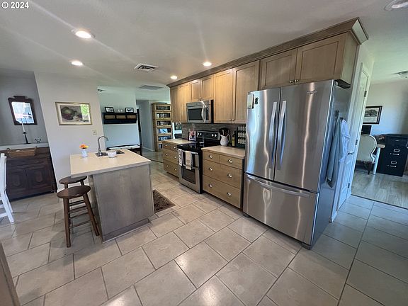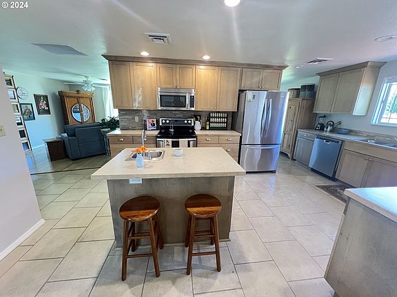 Welcome to your dream home in the charming town of Myrtle Creek, Oregon! This beautifully maintained 3-bedroom, 2-bath residence offers a perfect blend of classic charm and modern amenities. Step into the large kitchen where culinary dreams come true. Outfitted with stainless steel appliances, an electric range with double ovens, a convenient pantry, and a reverse osmosis system. The island with a prep sink and stunning mountain views from the kitchen window make this space a chef's delight. The primary bathroom has been thoughtfully updated, featuring a large, doorless tile shower. The living room is a cozy retreat with its brick, wood-burning fireplace serving as a charming focal point. The exterior of the house is equally impressive, boasting well-maintained flowers and foliage. A shed with electrical capabilities and RV parking add versatile utility. The large double-door garage comes equipped with a thermostat controlled exhaust fan, two openers and storage shelving, alongside a newer water heater and heat pump enhancing the home's efficiency. Out back, the deck offers a serene spot to soak up the sun and savor the breathtaking mountain views. Immaculately clean and move-in ready, this home is the perfect retreat for anyone looking to enjoy comfort and tranquility.