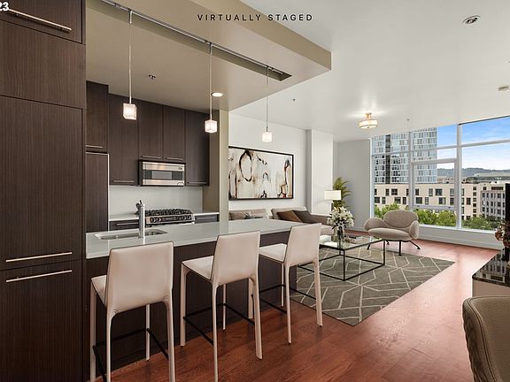 Welcome to the Encore, a place that offers an exceptional urban lifestyle in one of the most sought-after locations in the Pearl district.Take in the captivating views of the Willamette River, West Hills, and enjoy the serene beauty of breathtaking sunsets, whether inside or on the balcony.This light-filled unit features quartz counters, Bosch appliances, wood floors, and a flex space that can function as a home office or guest accommodations, complete with a Murphy bed and a new memory foam mattress.The primary en-suite bedroom, with a walk-through custom closet, provides ample storage and organization solutions. Modern touches throughout the condo enhance both convenience and livability efficiency.Building amenities include an on-site manager, Strong HOA, gym, and community room. Deeded parking and storage included. Step outside to a 3-acre park, building café, dining, breweries, streetcar, and many more neighborhood amenities. This is a perfect place to call HOME!