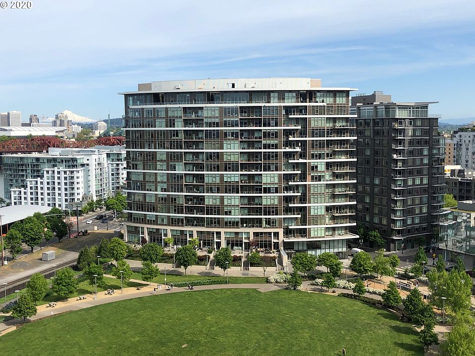 Enjoy the best of an urban lifestyle in this beautiful condo. The wall of windows lets in tons of natural light. 26ft balcony provides Mt Hood and river views. Newly painted, NEST thermostat, Mstr suite w/closet organizers, full-size wash/dryer. This floor plan offers the ability to configure the dining into an office or 2nd bedroom. Parking+storage Incl. Step out the front door to a 3-acre park, Ovation Cafe, coming soon is an Italian market place close by. View the 3-D tour and fall in love!