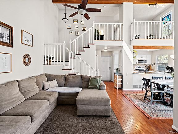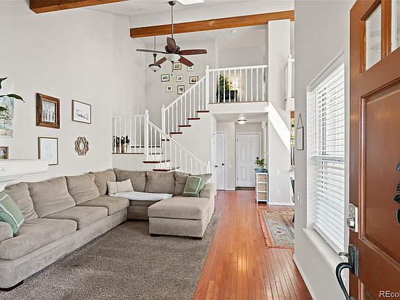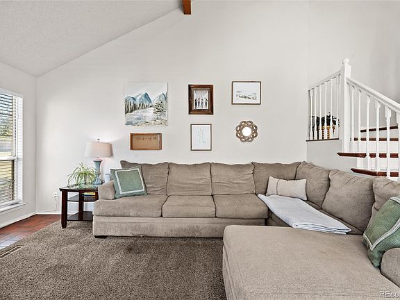 Fantastic END UNIT townhome in a wonderful community! The main level of this exceptional residence features soaring vaulted ceilings with exposed wood beams, abundant natural light, a spacious living room with a wood-burning fireplace, a dining room off the kitchen with easy sliding door access to the private deck, a beautifully updated kitchen with granite counters/newer stainless steel appliances/counter seating, an updated powder room, a pantry, and access to the oversized attached 2-car garage with its built-in shelving and bonus refrigerator (included!). The upper level features a primary suite with a recently renovated bathroom and two closets, a second bedroom, a full hallway bathroom, a loft flex space (the perfect place to work from home!), and a linen closet. The basement offers additional finished space for a living room and/or bedroom with an egress window, closet, bathroom, and a storage/mechanical/laundry room. The outside deck offers great private outdoor space, and the community includes a pool, a clubhouse (rentable for events), a park with a gazebo, and tennis courts (currently out of service). The HOA includes exterior maintenance, snow removal, trash/recycling, sewer, and more! New roof installed in 2019! Showings begin April 10th--schedule yours today! Buyer to verify all information.