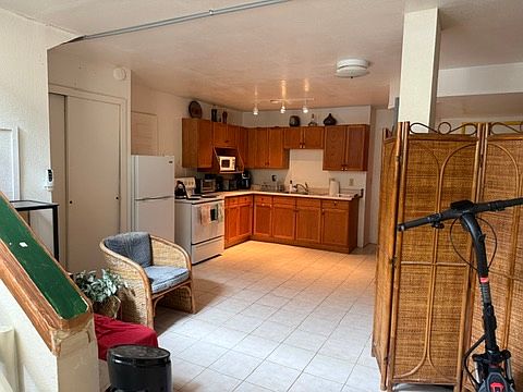 The private room is approximately 250 sq ft on the accessible bottom floor with no stairs, offering privacy and convenience. There is a private bathroom in the room. Shared spaces include a kitchen (pictured) with full-size appliances, a microwave, filtered water, and a small dining table. On-site washer and dryer access on the ground floor. This rental requires a 1-year lease with immediate move-in. Rent is $1,000/month, including water and electricity. A $25 application fee applies for tenant screening. No pets and no smoking are allowed. The lease outlines tenant and landlord responsibilities, including timely rent payments and proper care of the unit. The room is on the bottom floor with no stairs for easy access. Utilities like water and electricity are included. Viewings are by appointment only.