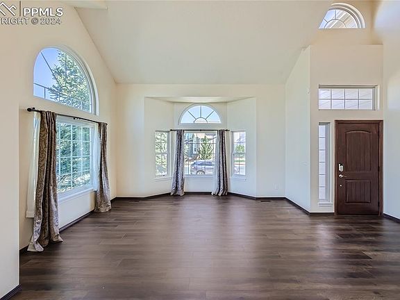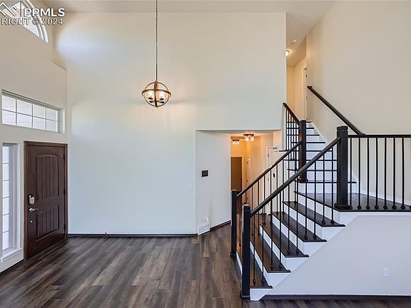 Stunning and newly remodeled 6-bedroom home in award-winning D-20 schools, nestled on a .24-acre corner lot with beautiful Pikes Peak views! Soaring 2-story ceilings, multiple living/dining areas, exquisite gourmet kitchen with quartz countertops and solid cherrywood cabinetry, warm gas fireplace, luxurious master retreat with a beautiful custom bath, finished lower level, cost-saving solar panels, and a large fenced yard with views of sunsets over mountain peaks all showcase this beautiful home. A grand 2-story entry welcomes you inside to a tremendous open great room and formal dining area with luxury cocoa hardwood laminate flooring and soaring vaulted ceilings. The exceptional chef’s kitchen boasts rich Quartz Cambria countertops, Thomasville solid cherrywood cabinetry, glazed wood backsplash, soft-touch doors/drawers, LG Thin Q stainless steel appliances/refrigerator, oversized pantry, wine cooler, and a cozy eating nook plus a new counter bar for casual dining. A nearby family room offers walls of windows and a warm gas fireplace, perfect for cool Colorado evenings. Glass doors open to the rear deck, patio, and fenced yard with a storage shed and sweeping views. An open stairway leads up to the luxurious master retreat with high tray ceilings, walk-in closet, and generous sunlight-filled windows. Arched doorways open to a beautiful 5-piece bath with a stand alone soaking stone tub, walk-in shower, and a vanity with double sinks - a private relaxing sanctuary. Three additional upper-level bedrooms share a full hall bath. The finished lower level boasts a storage room with shelving and 5th/6th bedrooms with a full bath, offering quiet privacy for family and guests. Other home features include a new roof, new windows, new lighting, new flooring/carpeting/tile work, main-level laundry, and a 2-car oversized garage with new overhead door. In an excellent location near the USAFA, shopping, dining, and D-20 schools, this incredible home is not to be missed!