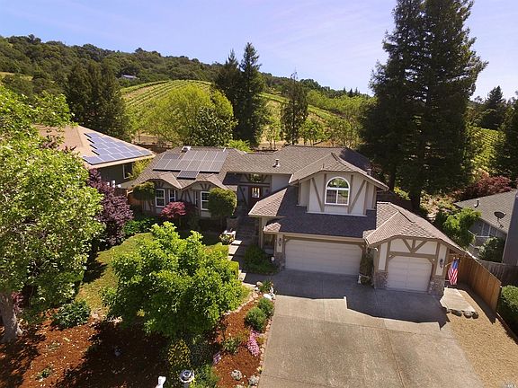 Prestigious Vinecrest Estates! Beautiful landscaping and gorgeous vineyard views await in this 3 Br+ office/den, 3 full Ba Tudor style home. The large kitchen overlooks the family room and boasts stainless appl. and updated cabinetry. French doors lead to the sunny backyard, several decks and gazebo. The perfect guest suite is located downstairs with its own access to the stunning yard. A 3-car garage affords room for your cars and a workshop!