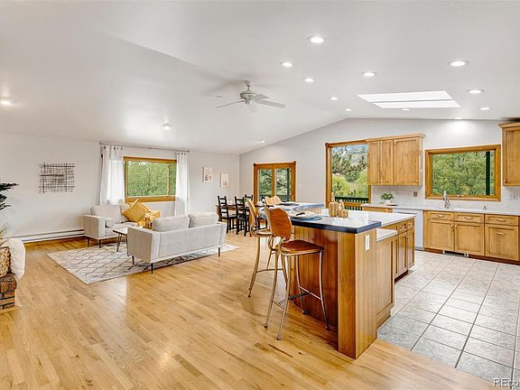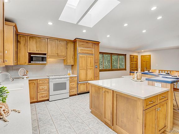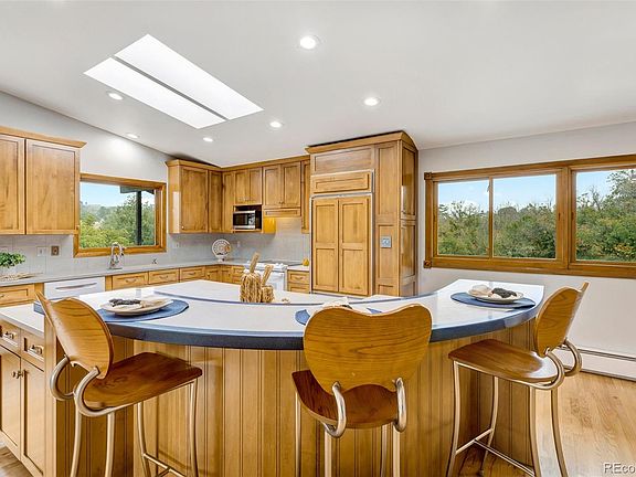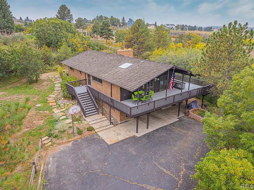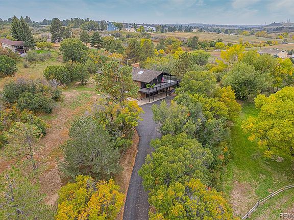 Escape to this ultimate peaceful location and bring your horses and pets. This is an opportunity for great value with a home on 1.43 acres! When you walk into this home's open floor plan with its skylights and large wood-trimmed windows, you will experience a lot of natural light. Wood flooring is throughout the main level and 2 of the bedrooms can be used as a guest room or office. The kitchen offers beautiful cabinetry, a large island with lots of seating and counter space. There is a sub-zero refrigerator built-in to match. A favorite part of the home is the large wrap around composition deck ready for entertaining or just relaxing with nature. You can escape to the open and bright basement to cozy up to the fireplace. The basement is ground-level accessible, so it can easily be a separate living/working area. Garage floor is epoxy-coated. Plenty of privacy with a home surrounded by many trees including evergreens. Take a quiet stroll down to the small running stream on the west property line. The home has been well-cared for and is a terrific opportunity in this type of a location. The well-kept bridle trails and a riding arena are part of the optional HOA. All conveniences within 10 minutes to Castle Rock and Lone Tree.