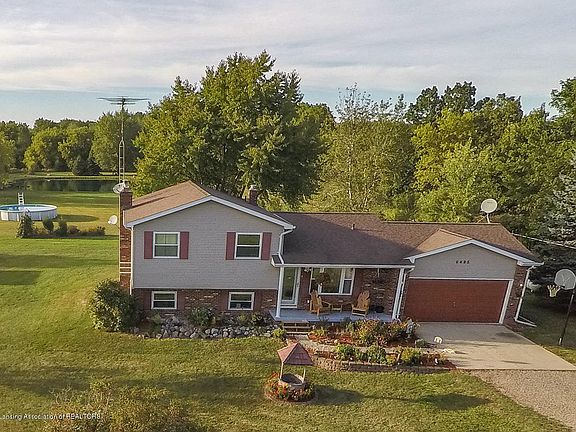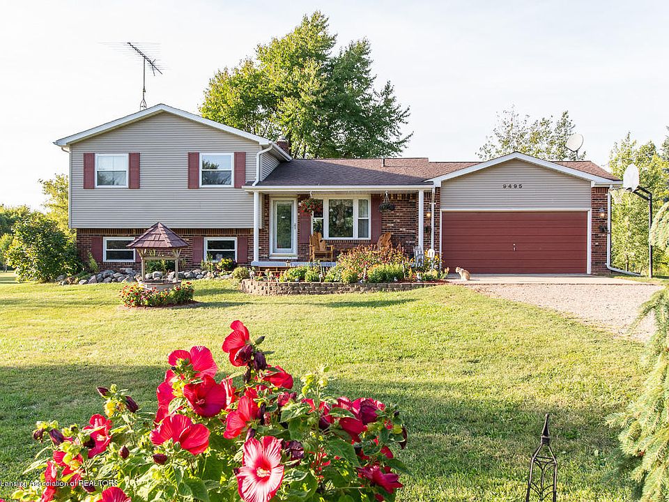 Tranquil 10 acre setting with a pond, and a fruit orchard! Concrete Porch, Deck, and invisible fencing. Well maintained Quad Level home. Living Room with large sunny window. Oak Kitchen with stainless steel appliances, Pantry, and slider to the back deck. LL Family Room with wood burning stove. 3 nice size bedrooms with good closet space. 2 car attached Garage, 10' x 14' Shed plus a 32' x 40' Pole Barn. Pirate Ship Play set is reserved.