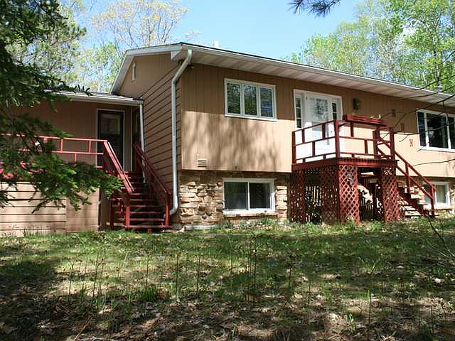 Private and quaint wooded property next to 1000s of acres of Northern Highland American Legion State Forest. Near Witches Lake Boat Landing and surrounded by quality lakes. Main Level offers open concept in Kitchen/Dining area with a large Living room and Stone Fireplace. Master Bedroom has wall to wall his/her closets, Bath and Den. 2nd Bedroom, full bath, laundry and 34x24 Family room with an exit entry on the lower level. 2.5 car detach garage for a workshop, paved driveway and 16x9 Outbuilding for additional storage. This is a great deal for the space and privacy for year round or seasonal getaway home!
