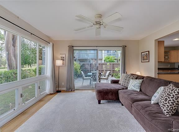 What a gem! Rarely available well taken care of fully furnished 3 bedroom, 2.5 bath townhome directly on Mililani Golf Course. Enjoy the fantastic golf course views from the high quality floor to ceiling vinyl windows in your living room as well as your master suite. Each bedroom has its own lanai with great views. This townhouse unit is located at the end of the complex and boasts plenty of privacy. Front fenced patio as well as back fenced patio allow for plenty of outdoor space to entertain. You will love all the natural light in this home and the great cross ventilation allows you to keep cool in the fresh Mililani air. Open and inviting living and kitchen space where everyone will want to congregate. 1 car garage offers even more storage space and a separate laundry area.