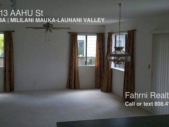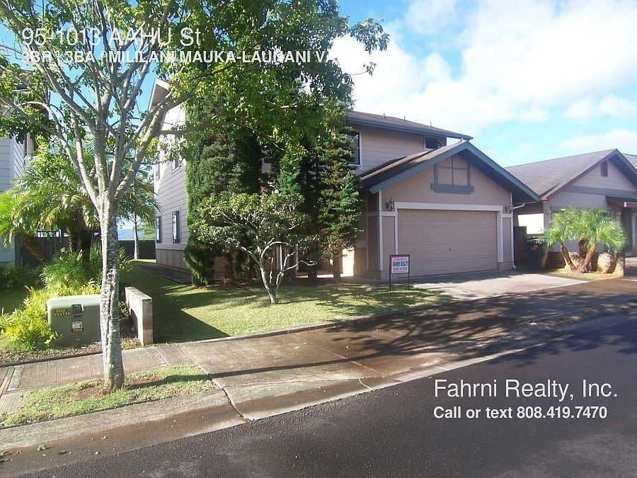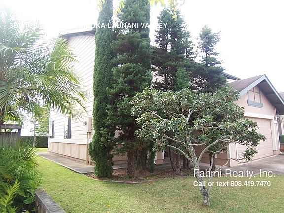 SCHEDULE A SHOWING ONLINE AT: showmojo.com/lh/6dd911f01d Open feel ~ Desirable Single Family 2 Story well cared for home. Nice 3 bedroom 2 full baths and 1/2 bath downstairs, 2 car garage, washer/dryer & Alarm System. Beautiful Kitchen Corian counter tops, TV room upstairs, Fenced Yard, Bedroom has a walk in closet. Masterbath has his & her sinks. Yard service included. Mountain & Park View. Few minutes from Mililani Town Center, Close to Schofield and Wheeler Army Air Field. Tenant pays for Cable, Water/Sewer and Electric. To schedule a showings use our automated showing system ShowMojo. Small Pet negotiable ( w/ approval) Pet insurance, Pet reference & Pet Deposit required. www.Fahrnirealtyhawaii.com Fahrni Realty 808-486-4166 RB:7761