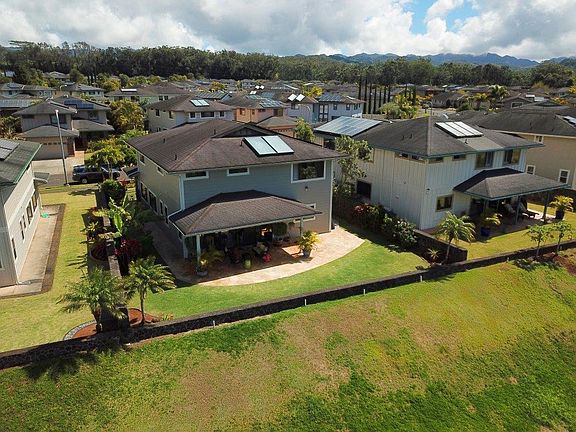 Elegantly appointed home boasting views of the ocean, mountains & sunset. Situated behind open space that can't be built on. The open concept living & kitchen feature large island, granite counters, oversized pantry & premium appliances including sub zero refrigerator. Expansive master suite, 1st floor bedroom & bath great for guests or if you're looking for a 1st floor master, an office & loft with potential as a rec room or tv room. The home offers beautifully engineered wood floors, plantation shutters, central A/C & PV owned panels with net metering & solar water heater. The covered lanai and tropical landscaping provide an ideal outdoor entertaining area for guests. Mililani Mauka is a quiet neighborhood that offers community amenities including 7 rec centers, 6 pools & walking paths.