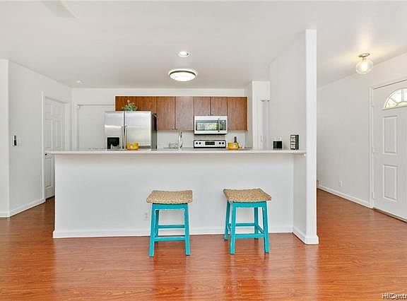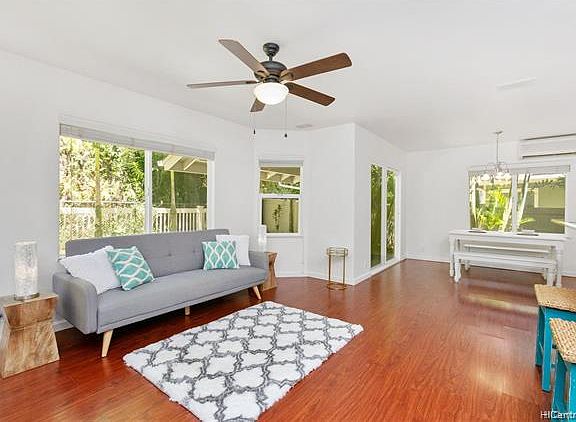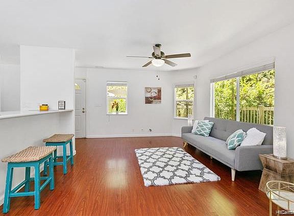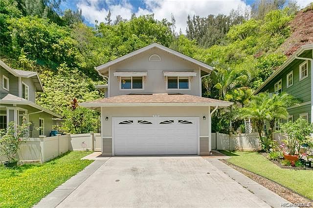 Welcome to the cool, quiet and friendly neighborhood of Woodcreek Crossing in the lush and beautiful Launani Valley, just north of Mililani Mauka. This move-in ready, DETACHED single-family home boasts 4 bedrooms and 2.5 baths with a fenced in yard, perfect for pets, relaxing and entertaining guests. Tropical landscaping surrounds the home for added privacy. Wood-like laminate flooring downstairs and W/W carpet upstairs. Two car garage with a noticeably larger driveway for extra parking and a bonus with guest parking directly across. Only 7 minutes to Wheeler Air Force Base, 15 minutes to Schofield. Easy H2 access and low association fees.