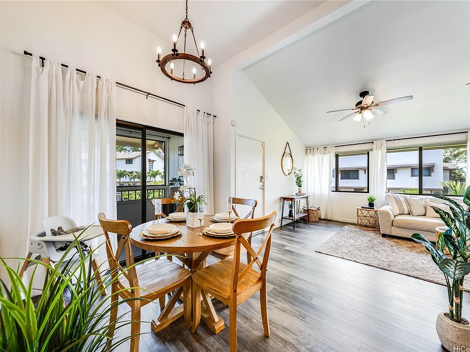 Golf Course Views from this Renovated 2-bedroom / 1.5-bath Townhome with Low Maintenance Fee and 2 Parking Stalls! Highly sought-after Kuahelani Apartments, is nestled along the lush greens of Mililani Golf Club’s Golf Course. This corner-end unit features incredible vaulted ceilings, oversized windows that bathe the living space in natural light & a massive screened-in lanai perfect for indoor-outdoor relaxation. Upgrades include luxury vinyl plank flooring, a newer modern kitchen with sleek cabinetry & stainless steel appliances renovated in 2018 & spa-like renovated bathrooms. Large exterior owner storage room & your 1 covered / 1 open assigned stall near unit!