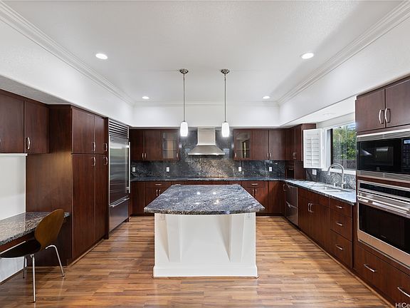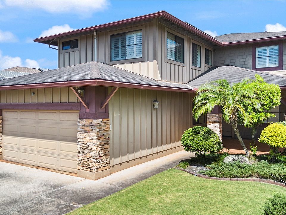 Welcome to the coveted 'Kapanoe' neighborhood of Mililani Mauka. Here we have a luxurious American Classics (model 4) estate tucked away on a tranquil cul-de-sac in Mililani Mauka. This expansive 4-bedroom, 3-full-bathroom home, built in 2005, spans 2,806 interior square feet on a generous 6,160 sq.ft lot with a professionally landscaped yard, offering ample space and elegant design. Enjoy the convenience of having a bedroom and full bathroom on the ground level—a sought-after layout not often found. Step inside to a freshly painted interior showcasing contemporary features like high-end Sub Zero and Wolf appliances and elegant wood flooring, with brand-new carpeting in the bedrooms adding a touch of comfort. Granite countertops and custom built-in closet systems enhance both style and organization, while the 35 photovoltaic panels bring sustainability and efficiency. A rare blend of luxury, comfort, and efficiency awaits in this peaceful Mililani Mauka gem!