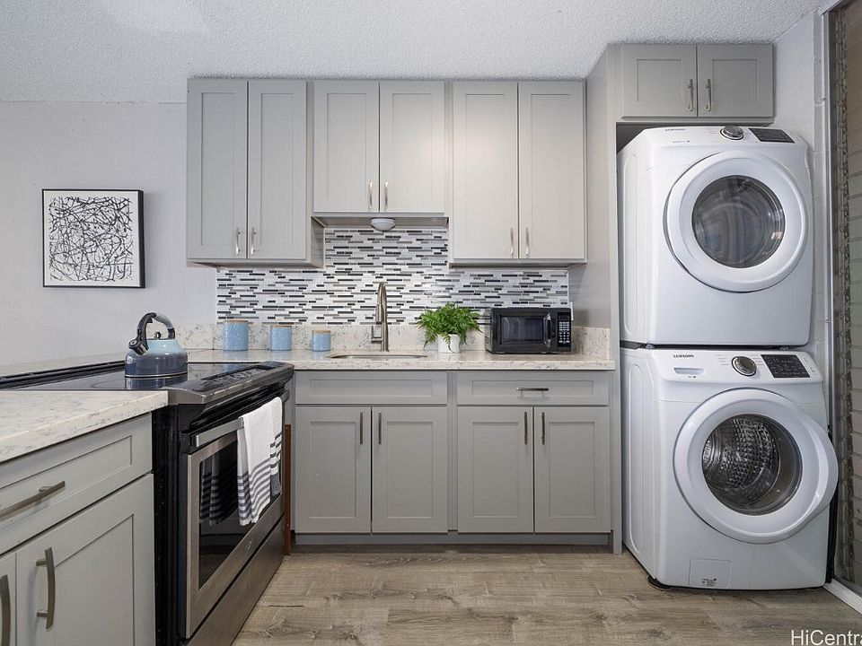 Seller to credit buyer $5k for closing cost or interest rate buy down for full price offers only. Welcome Home to this upgraded turn key ready 2 bedroom 1 bathroom 2 parking condo in Mililani. This home sits in the back of the property for a more peaceful vibe. All major appliance are in home including full size washer dryer. Luxury vinyl plank flooring and open concept. Enjoy the cool Mililani breezes on your private lanai. Large kitchen with beautiful tile backsplash, tons of storage, and farm sink. The community has great amenities with a pool, BBQ, recreation areas, and much more. The home also comes with 2 parking spots. Located in popular Mililani, close to shopping, schools, dining and military bases. Great for started home or investor.
