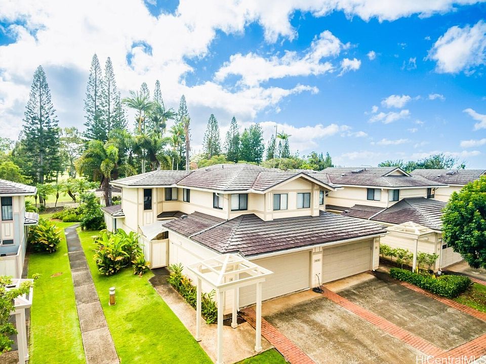 Welcome home to this rarely available townhome in beautiful Pinnacle. This amazing floor plan has been upgraded and shows pride of ownership. Enjoy the newly renovated kitchen with high-end appliances, added recessed lighting, soft-closing cabinets, granite countertops with tons of storage, and room for cooking and entertaining. Open concept throughout the downstairs offering space for formal dining and an office nook. Situated behind the private community pavilion and next to the 16-hole on the Mililani Golf Course. This townhome offers indoor-outdoor living with a private fenced-in yard in the cool Mililani area on a cul-de-sac street. Newly installed vinyl flooring throughout the home, new paint, dimmable lighting, tamper-resistant outlets, new fans, and blinds, spacious living room with lots of natural lighting and wave mural. Upstairs hosts two primary bedrooms with ensuites with mountain and golf views. 2 car garage with 2 car parking in the driveway along with guest parking.Covered entryway and outside lanai. HOA covers roofing, painting, internet, cable, and common areas. This home is closely located to schools, shopping, beaches, military bases, and much more.