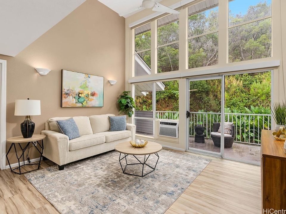 Welcome home to this quiet, peacefull 3 bedroom, 2 bathroom 2 parking condo in beautiful Evergreen Terrace. This open floorpan concept has vaulted ceilings with high windows allowing wonderful natural lighting and stunning views of the tranquil wooded area behind the community. Enjoy the updated kitchen with all major appliances included. The kitchen opens up to the dining area and large living room. Updated laminate flooring throughout the home. The large primary host and ensuite, large closet, private entry to oversized lanai. Enjoy relaxing outside listening to the cool Mililani breezes or hosting guests. AC units included as well as full size washer and dryer. Upstairs, you will find a large carpeted room/loft area ideal for company, office space, play area, or additional living/bonus room. Off the side of the loft/room you will find a large walk in storage closet. This community offers a private pool and playground area. This home comes with additional storage, one assigned covered and one open parking lots of guest parking. Close to the H2, Schofield, Wheeler Army Airfield, shopping, schools, dinning, and beaches. Call today for a private showing, this one will not last long!
