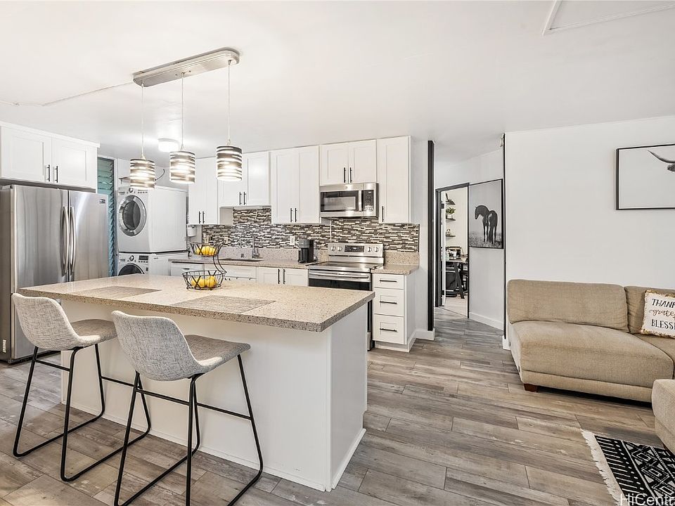 Immerse yourself in the tranquility of Launani Valley and call Waikalani Woodlands home. This unit offers a captivating open concept design, highlighted by a spacious granite island, creating an inviting space for gatherings. Revel in the luxurious upgrades of the primary bedroom, featuring a stylish barn door for the bathroom and a walk-in shower. Freshly painted walls, sleek vinyl flooring, soft close cabinets, and the granite island enhance the modern appeal of this unit. Embrace lush greenery combined with comfort and sophistication in this unit.