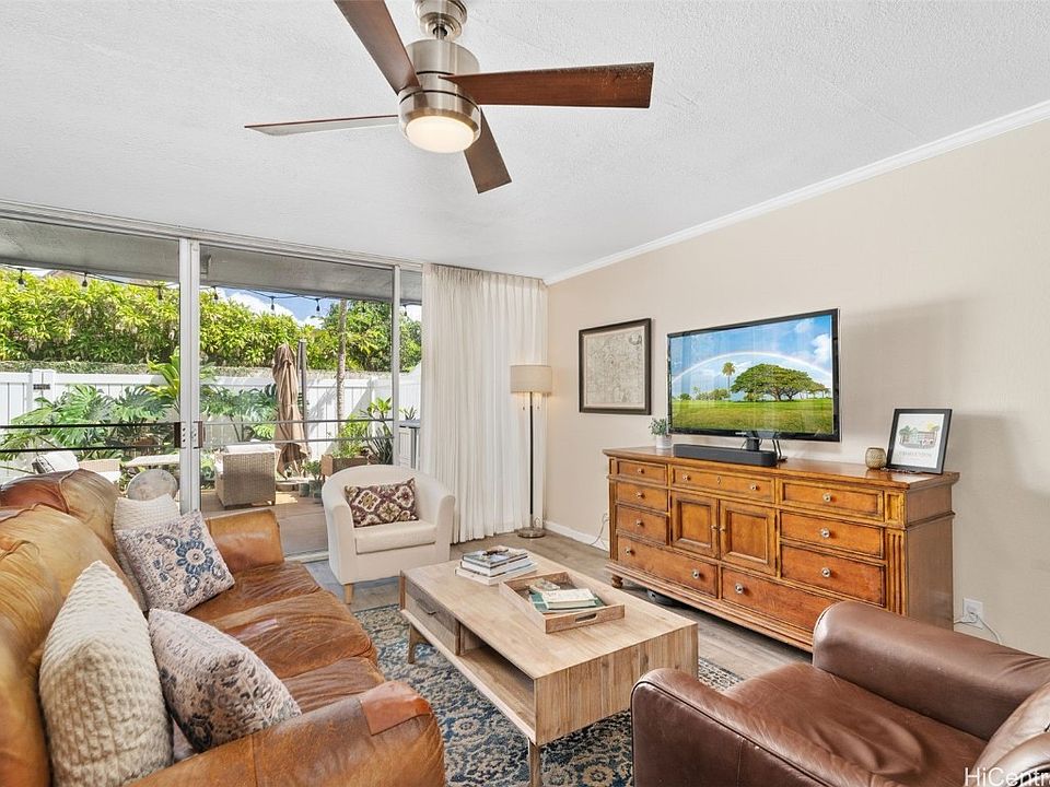 Immerse yourself in this elegantly upgraded 3-bedroom, 2.5-bathroom townhome in sought-after Mililani Garden Homes. The open floor plan features a spacious kitchen with cherry cabinets, stainless steel appliances including a dual convection oven, and a stylish backsplash. The adjoining living room flows into a private, lush backyard, perfect for relaxation and entertaining.
