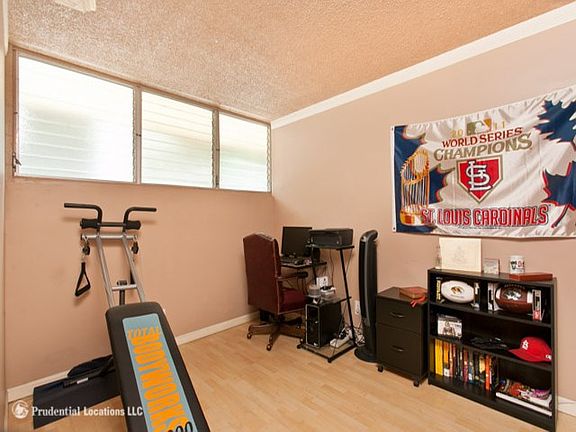 Nicely upgraded top floor unit with concrete walls covered with sheet rock and crown molding. Real bamboo flooring in the kitchen and Ipe decking tiles on the lanai. 6 mo old large refrigerator and newly installed roll up window coverings in living room and master bedroom. The parking stall is only one flight of stairs below the unit. First open house on January 4 at 2-5 PM.